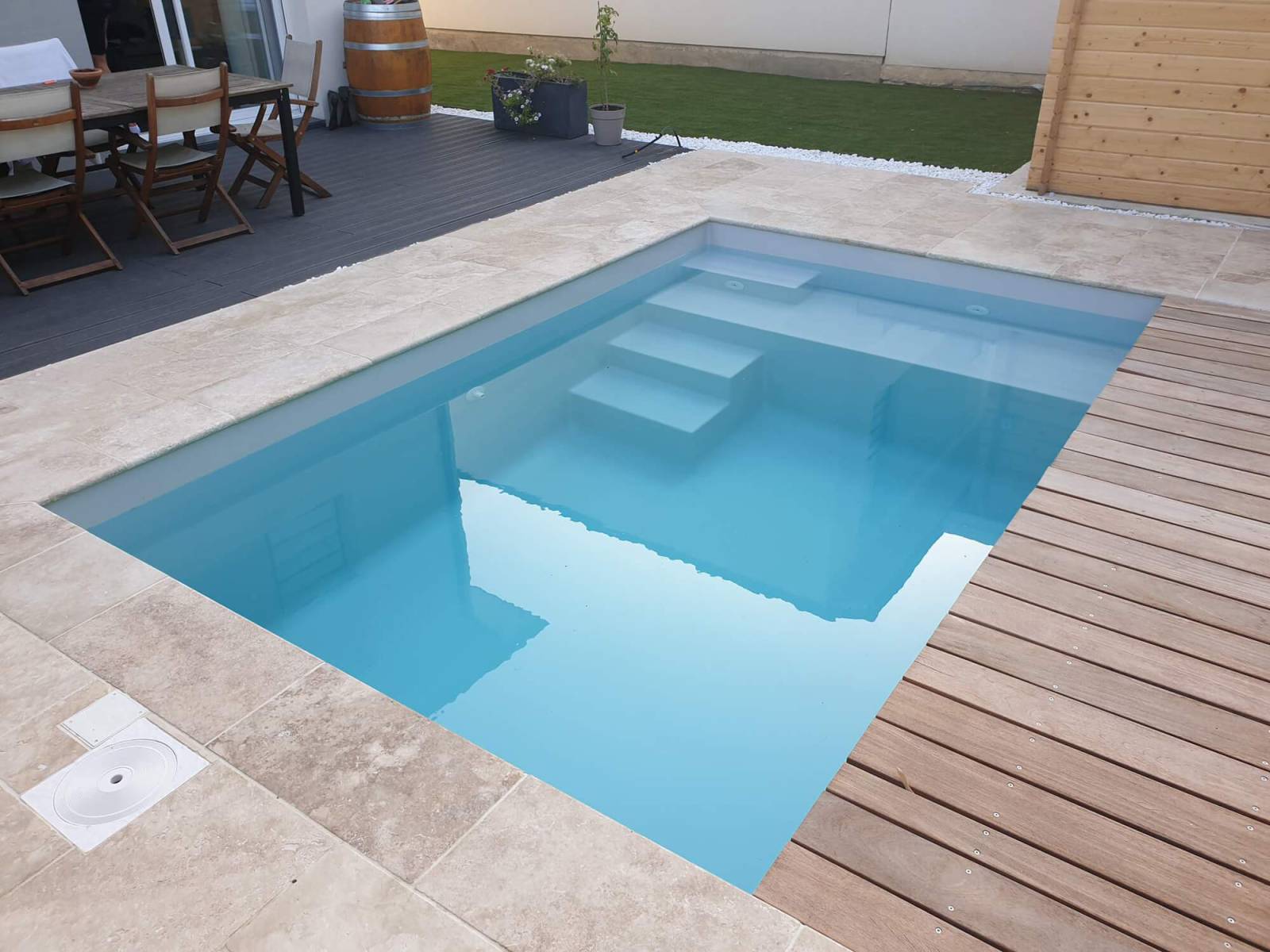 Grâce à ses dimensions compactes, cette piscine est conçue pour s'intégrer facilement dans tout type d’espace extérieur, qu'il s'agisse d'un jardin de petite taille ou d'un espace plus vaste. Sa longue plage immergée invite à la détente, offrant un endroit idéal pour se relaxer, se rafraîchir et partager des moments agréables en famille ou entre amis.