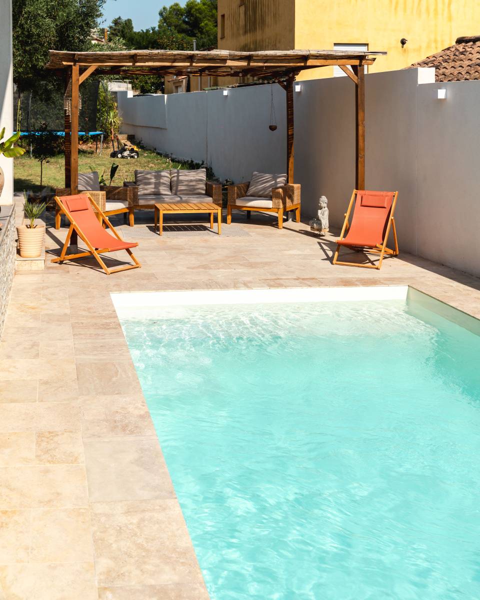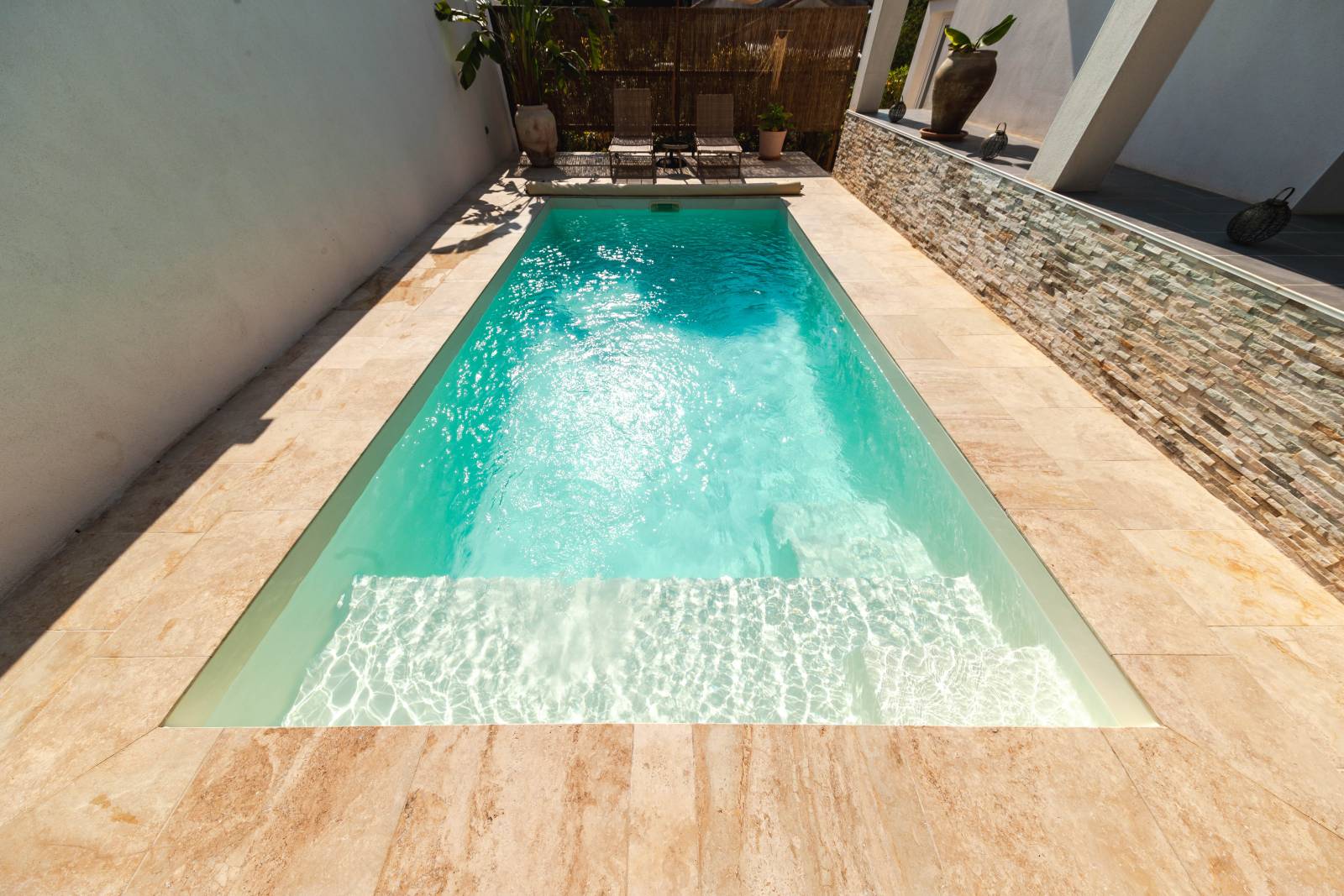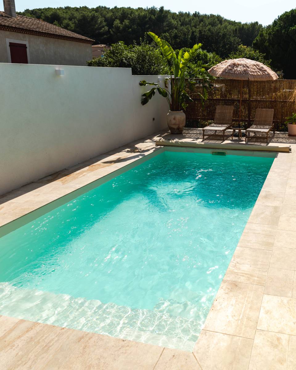Cette harmonie entre le minimalisme de la piscine et les matériaux naturels environnants crée un espace extérieur élégant et apaisant, idéal pour la détente et l’évasion.