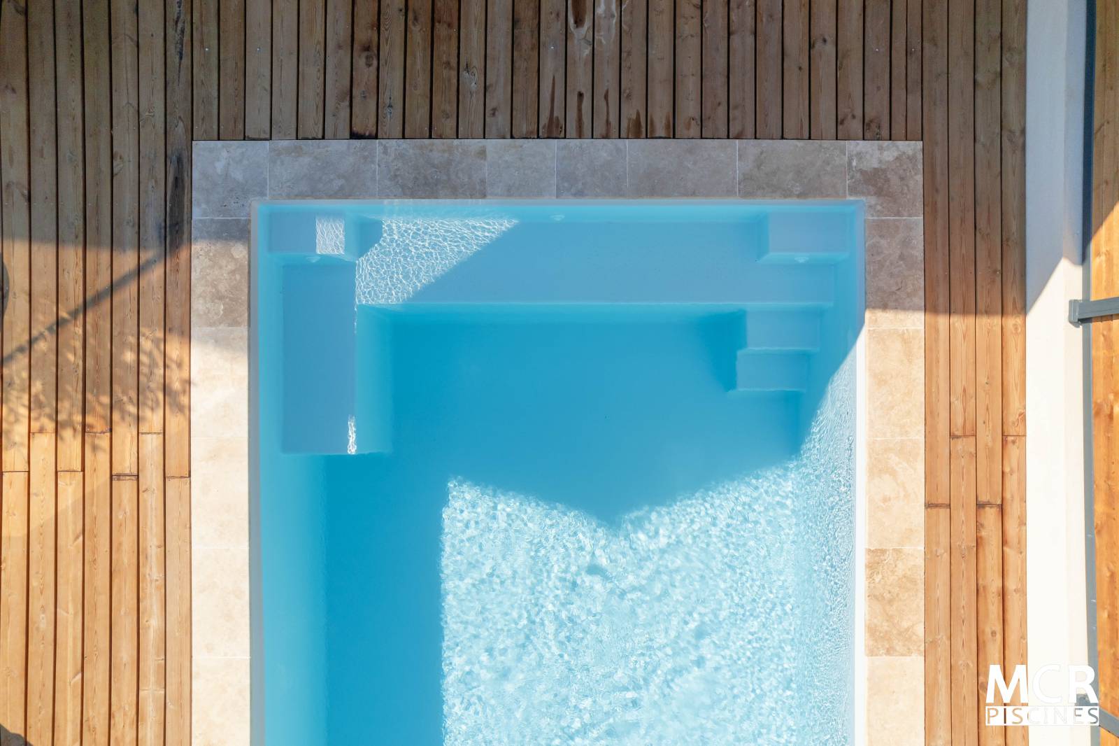 Son escalier, discrètement intégré, optimise l'espace de baignade, tandis que sa généreuse banquette invite à la détente et au confort.