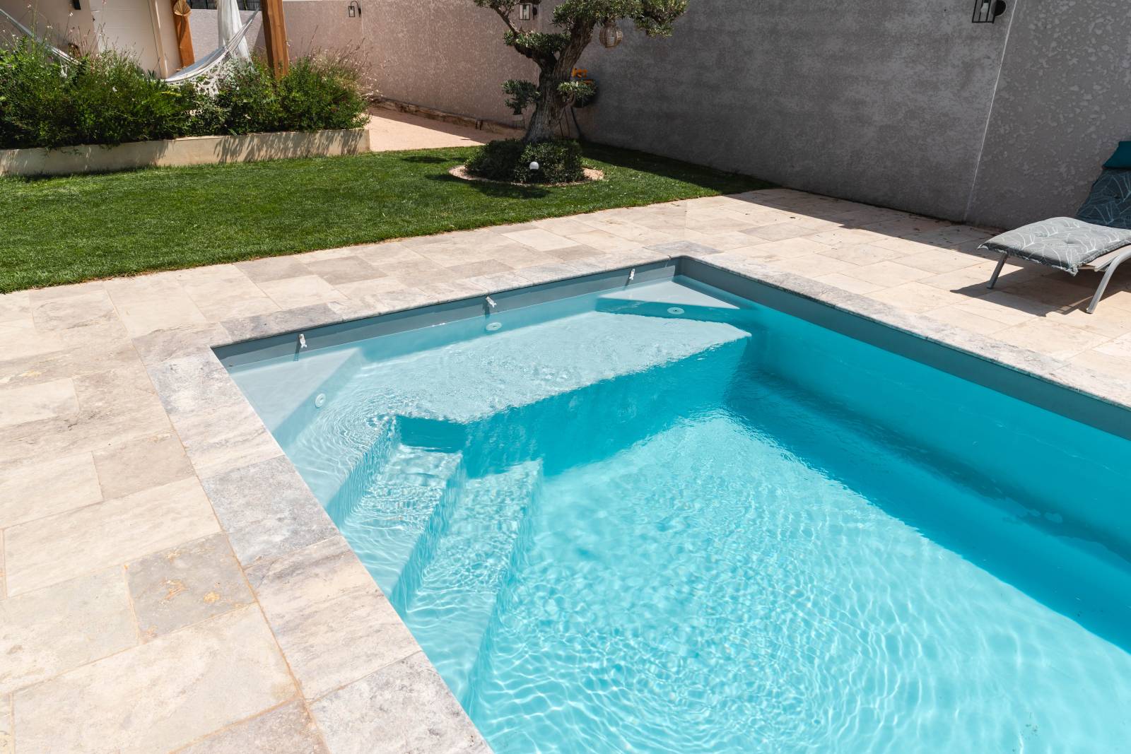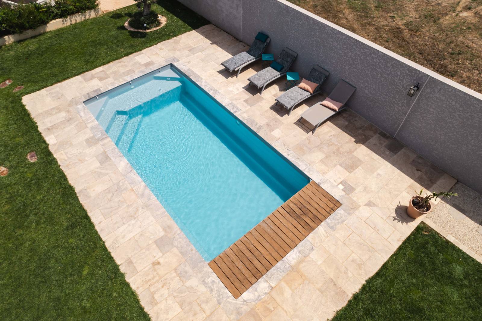Un modèle élégant mesurant 7,80 x 3,45 mètres, avec un fond plat de 1,50 mètre de profondeur. Son design intègre une vaste plage et un escalier aux lignes géométriques, apportant une touche raffinée à votre espace extérieur.